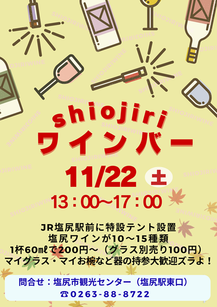 11月22日(土)にJR塩尻駅東口で塩尻ワインバー行います。
